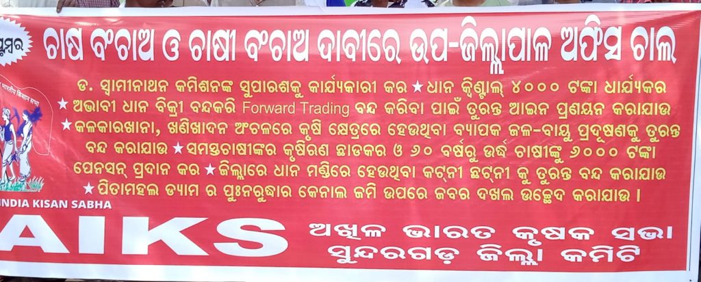 ଚାଷ ବଞ୍ଚାଅ ଓ ଚାଷୀ ବଞ୍ଚାଅ ଦାବୀରେ ଅଖିଳ ଭାରତ କୃଷକ ସଭା, ସୁନ୍ଦରଗଡ଼ ଜିଲ୍ଲା କମିଟି ତରଫରୁ “ପାନପୋଷ ଉପ-ଜିଲ୍ଲାପାଳ ଅଫିସ ଚାଲ” ଅଭିଯାନ ଅନ୍ତର୍ଗତ ବିକ୍ଷୋଭ ପ୍ରଦର୍ଶନ ହୋଇଯାଇଅଛି । ଏହି ଅବସରରେ ଅଖିଳ ଭାରତ କ୍ରୁଷକ ସଭା, ସୁନ୍ଦରଗଡ଼ ଜିଲ୍ଲା କମିଟି ତରଫରୁ ପ୍ରଧାନମନ୍ତ୍ରୀ ଓ ମୁଖ୍ଯମନ୍ତ୍ରୀଙ୍କ ଉଦ୍ଦେଶ୍ୟରେ ଏକ ଦାବୀପତ୍ର ପାନପୋଷ ଉପ-ଜିଲ୍ଲାପାଳଙ୍କୁ ପ୍ରଦାନ କରାଯାଇଛି । ଏଥିରେ ଡକ୍ଟର ସ୍ବାମୀନାଥନ କମିଶନଙ୍କ ସୁପାରିଶକୁ କାର୍ଯ୍ୟକାରୀ କରିବା, ଧାନ କ୍ବିଇଣ୍ଟାଲ ୪ ହଜାର ଟଙ୍କା ଧାର୍ଯ୍ୟ କରିବା, ଅଭାବୀ ଧାନ ବିକ୍ରୀ ବନ୍ଦ ସହ ଫରଓ୍ବାର୍ଡ ଟ୍ରେଡିଂ ବନ୍ଦ ଆଦି ପାଇଁ ତୁରନ୍ତ ଆଇନ୍ ପ୍ରଣୟନ କରାଯିବାକୁ ଦାବି କରାଯାଇଛି। ଅଖିଳ ଭାରତ କୃଷକ ସଭା, ସୁନ୍ଦରଗଡ଼ ଜିଲ୍ଲା କମିଟିର ସଦାନନ୍ଦ ସାହୁଙ୍କ ନେତୃତ୍ୱରେ ଅଖିଳ ଭାରତ କୃଷକ ସଭାର ସ୍ଥାପନା ଦିବସ ଉପଲକ୍ଷେ ୨୦ଟି ଦାବିକୁ ନେଇ ବିକ୍ଷୋଭ ପ୍ରଦର୍ଶିତ ହୋଇଥିଲା।